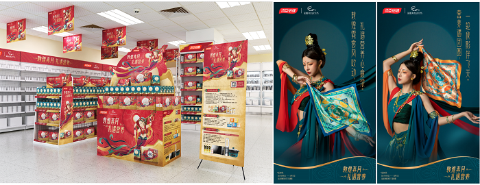 此次聯名突破傳統方式,以#敦煌奔月,禮遇營養(yǎng)#為主題,將禮盒設計、美陳物料、創(chuàng)意內容、互動玩法,都緊扣敦煌文化的祥瑞象征與消費者佳節(jié)企盼美好的衷心祝愿。商超戶內戶外的快閃活動則以“敦煌飛天,營養(yǎng)有禮”為主題,設立拍照區(qū)吸引消費者停留,傳遞中秋送營養(yǎng)禮的信息,進一步驅動購買。