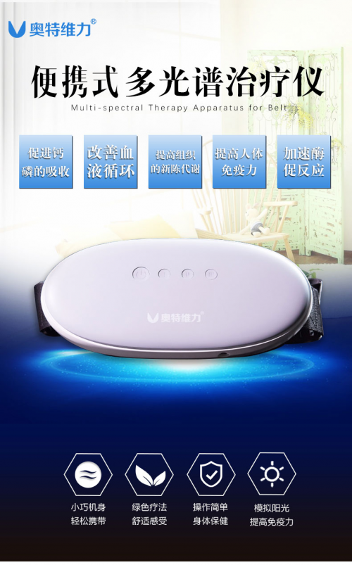 除了醫(yī)院用的臺(tái)式“多波段光譜治療儀”,奧特維力還在積極研發(fā)家用便攜式多光譜治療儀。目前腰帶式多光譜治療儀已經(jīng)上市,輕便小巧的腰帶式多光譜治療儀和醫(yī)院的設(shè)備一樣,采同樣用了窄譜中波紫外、紅光、紅外光綜合應(yīng)用。UVB直接照射皮膚,可使皮膚上的7-脫氫膽固醇轉(zhuǎn)變成維生素D3,促進(jìn)鈣磷的吸收,調(diào)節(jié)鈣磷代謝,從而提高人體免疫力,預(yù)防和治療維生素D3缺乏和不足;紅光和紅外光可改善血液循環(huán),提高組織的新陳代謝,同時(shí)適宜的溫度提高酶的活性,加速酶促反應(yīng)。