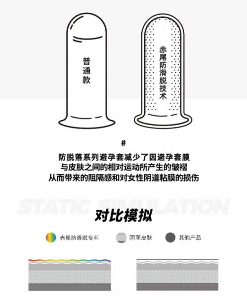 讓行業(yè)人士欣喜的是赤尾帶來了旗下新品避孕套“防脫落”、“無套感”等系列發(fā)布上市的喜訊,據(jù)了解其新品“防脫落”系列在技術(shù)上更是突破了業(yè)內(nèi)瓶頸,以獨(dú)有的“防滑脫”專利技術(shù)吸睛,“防脫落”系列的技術(shù)創(chuàng)新之處是借鑒了“壁虎爬墻”的原理,在避孕套的內(nèi)表面特定區(qū)域形成了亞微米超微結(jié)構(gòu),使避孕套的內(nèi)表面與對(duì)皮膚形成了物理抓取、無損粘合,減少了皮膚之間相對(duì)運(yùn)動(dòng)所產(chǎn)生的皺褶,保持在性愛過程中避孕套膜與皮膚的共性,做到了真正的貼合及防脫落效果。