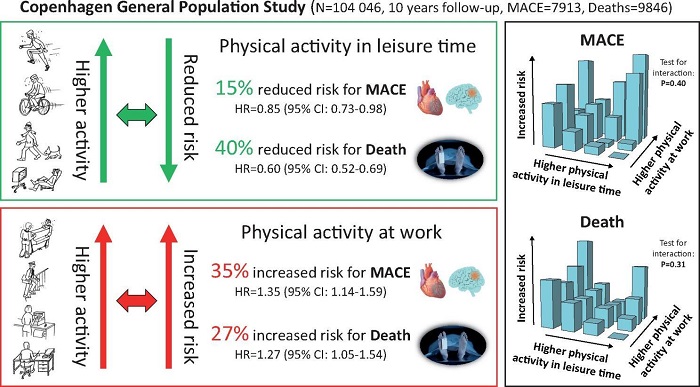 2021年4月,《歐洲心臟雜志》發(fā)表了一項來自丹麥哥本哈根一般人口研究(CGPS)的分析結(jié)果——從10.4萬名參與者10年的隨訪期狀況來看,工作時做的高強(qiáng)度體力活動,與主要心血管不良事件(MACE)風(fēng)險上升35%密切相關(guān)[1],而工作休息之余做同樣強(qiáng)度的體力活動,則與MACE風(fēng)險下降15%有關(guān)。