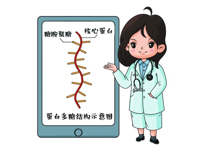 軟骨的基質(zhì)主要是由軟骨細(xì)胞所分泌出的蛋白多糖(由氨糖產(chǎn)生)所構(gòu)成,屬于存在極高濃度的膠狀聚集體。蛋白多糖聚集體的形狀與蜈蚣相似,眾多的“足”主要是由硫酸軟骨素分子共同組成,而許多條類似蜈蚣形狀的分子組成一個網(wǎng)狀結(jié)構(gòu),就像是高度致密海綿狀網(wǎng)絡(luò)。[1]