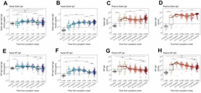 在對這些樣本進(jìn)行分析后,研究者發(fā)現(xiàn):感染新冠病毒后,人體血液中的抗新冠S蛋白IgA、IgG以及鼻腔中的抗新冠S蛋白IgG在12個(gè)月內(nèi)持續(xù)處于較高水平,但鼻腔中的抗新冠S蛋白IgA則只能存在6-9個(gè)月,隨后發(fā)生明顯的衰減。