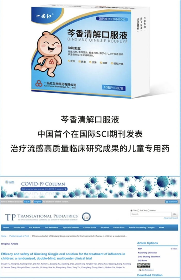 近日,國際SCI期刊Translational Pediatrics (《兒科轉(zhuǎn)化研究》)就權(quán)威發(fā)布一品紅兒童專用藥芩香清解口服液治療兒童流感臨床研究成果。研究結(jié)果證實(shí):單獨(dú)使用芩香清解口服液治療兒童流感可縮短患兒臨床痊愈時(shí)間及完全退熱時(shí)間,療效與奧司他韋作用相當(dāng),且咽痛、便秘等癥狀改善更優(yōu),安全性高,依從性好。