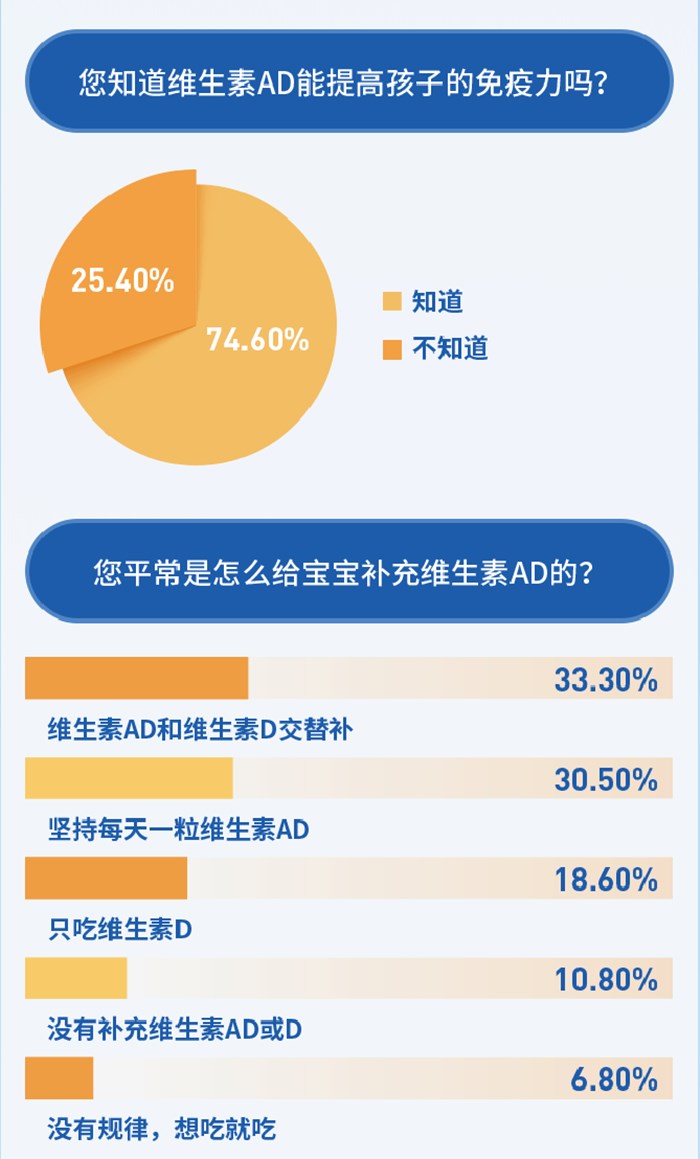 調(diào)查報(bào)告還顯示,雖然7成的家長認(rèn)可維生素AD對(duì)提高免疫力的作用,但有7成的家長用錯(cuò)了方法,比如選擇AD和D交替補(bǔ)、只補(bǔ)D不補(bǔ)A、補(bǔ)補(bǔ)停停等。專家提醒,家長一定要重視孩子日常營養(yǎng)的攝入,堅(jiān)持每天補(bǔ)充維生素AD是最佳方案。