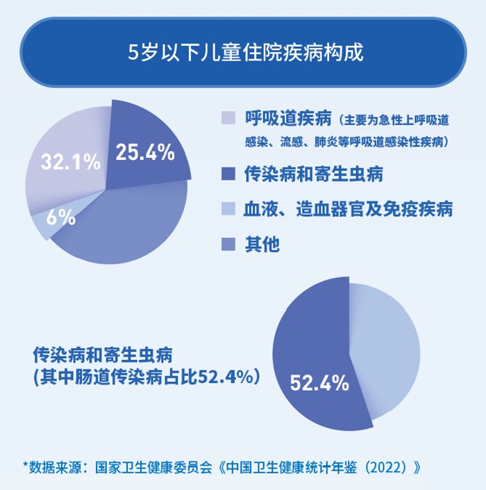 調(diào)查報(bào)告也顯示,0-14歲兒童住院病人中,5歲以下兒童占比65%,而住院疾病構(gòu)成中,呼吸系統(tǒng)疾病和腸道傳染病總體占比近50%,為住院疾病負(fù)擔(dān)主因。如何提高兒童免疫力,成了保障兒童健康的關(guān)鍵因素。