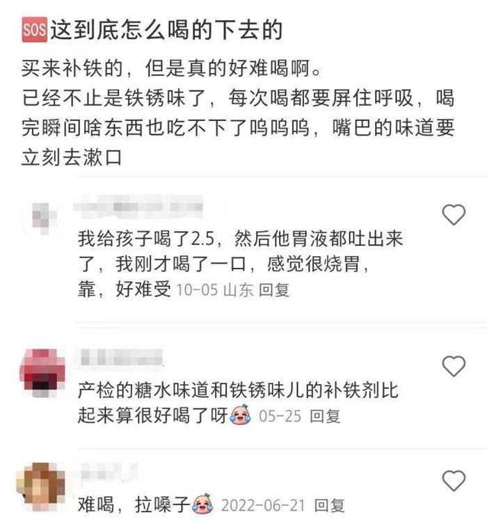 兒童缺鐵危害大,所以寶媽們對預防性補鐵逐漸重視。但“給寶寶喂服鐵劑為什么這么難”的話題在小紅書卻引起很多媽媽們的共鳴。有好奇的寶媽在嘗了寶寶服用的鐵劑后吐槽“鐵銹味道并沒有傳言那么小”;還有寶媽在評論區(qū)補充“感覺很燒胃,比糖耐時的糖水都難喝”。那么,有沒有一款既能征服寶寶口感偏好,又能保證療效的鐵劑呢?