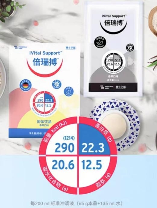 針對上述能量和蛋白質(zhì)的缺乏狀態(tài),建議在日常飲食的基礎(chǔ)上加用蛋白能量雙補(bǔ)的口服營養(yǎng)補(bǔ)充劑,例如倍瑞搏?。粉劑的倍瑞搏?每袋僅65g,可為機(jī)體提供290kcal能量,20.6g碳水化合物、22.3g蛋白質(zhì)和12.5g脂肪,有著高蛋白、高脂肪、高能量和低碳水的“三高一低”營養(yǎng)素配比。在蛋白能量雙補(bǔ)的同時,倍瑞搏?還特別添加了魚油[2],有抗炎和提升免疫力的作用。倍瑞搏?能夠同時為人們補(bǔ)充多種營養(yǎng),降低其營養(yǎng)不良的發(fā)生率。血糖代謝紊亂的人群可以另外選擇倍瑞蘋?口服營養(yǎng)補(bǔ)充劑。