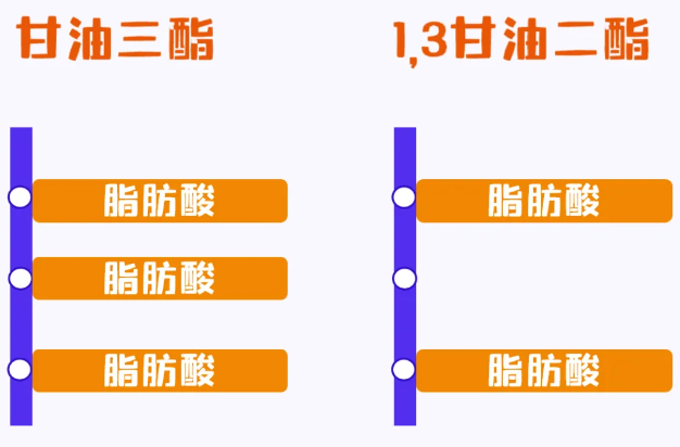 而甘油二酯,直觀看就是名字比甘油三酯少了一個“酯”,結(jié)構(gòu)上其實就是一個甘油分子連接2條脂肪酸,少了1條。