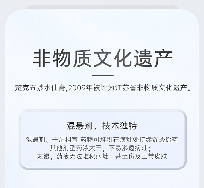 據(jù)《新安鎮(zhèn)志》記載,張山人將醫(yī)術以及自配的水晶膏傳給女婿——周達春的祖上周金和,從而開啟周家治病行醫(yī)的先河。在二百六十多年傳承中,周家后人對這一瑰寶藥方,不斷發(fā)掘調(diào)整。最后由周達春教授去除了糯米,加進黃柏、五倍子、紫草等成份定型申報國藥準字獲批。因改進后的藥膏猶如仙丹,加之藥方由五種物品巧妙組合產(chǎn)生神奇的功效,故最終命名為五妙水仙膏,并于1997年載入《中國藥典》。五妙水仙膏是中華文化瑰寶、是幾十代前人的智慧結(jié)晶,歷經(jīng)260多年傳承,于2009年被江蘇省政府列入非物質(zhì)文化遺產(chǎn)。