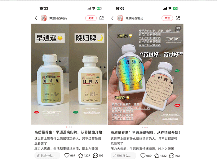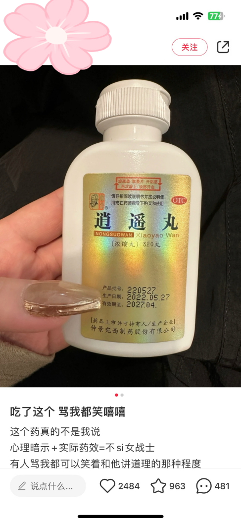 于是,她也在自己的“小紅書”賬號發(fā)帖稱“逍遙丸吃完是真的好逍遙”,引起了許多人的共鳴,更有網(wǎng)友戲稱逍遙丸為“含笑半步癲”“情緒穩(wěn)定劑”。