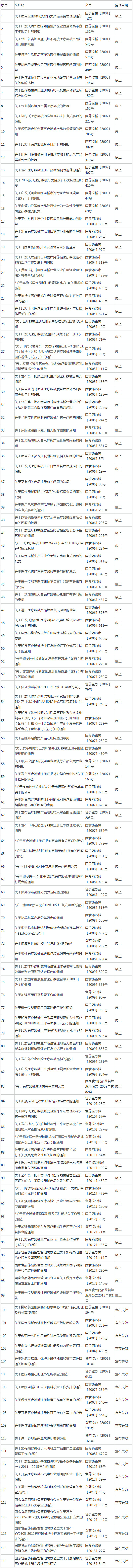 來(lái)源:藥源網(wǎng) 更新時(shí)間:2018/9/289月27日,國(guó)家藥品監(jiān)督管理局官網(wǎng)發(fā)布公告,對(duì)醫(yī)療器械規(guī)范性文件(1998—2013年)清理結(jié)果的予以公布。其中99項(xiàng)政策文件被廢止,20項(xiàng)宣布失效。同時(shí),繼續(xù)保留的有效文件有114項(xiàng)。