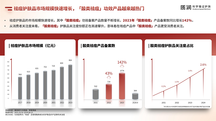 祛痘護(hù)膚品市場的快速增長,同樣得益于消費者對健康肌膚的追求和對護(hù)膚品成分認(rèn)知的提高。隨著消費者對護(hù)膚品成分和功效的關(guān)注增加,「酸類祛痘」產(chǎn)品因其明確的療效和科學(xué)依據(jù)而受到青睞。水楊酸與壬二酸作為祛痘的有效成分,得到國內(nèi)外指南的強(qiáng)力推薦,并被廣泛應(yīng)用于日常護(hù)膚品中。2023年「酸類祛痘」產(chǎn)品備案數(shù)同比增長142%,這一顯著的增長率預(yù)示著市場的廣闊前景。