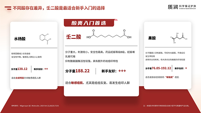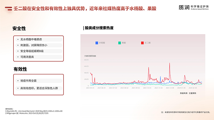 消費者對祛痘產(chǎn)品的選擇越來越傾向于科學(xué)、有效且溫和的產(chǎn)品。其中,水楊酸的使用率達(dá)到了70%,但其對敏感肌膚的適用性存在局限。相比之下,壬二酸以其抗炎、抗菌、抗角化等多重功效,以及對敏感肌膚的友好性,逐漸成為消費者的新寵。