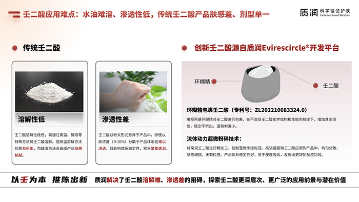 壬二酸雖為護(hù)膚“多面手”,但其自身水油難溶、滲透性低,極大限制了壬二酸的應(yīng)用。質(zhì)潤通過Evirescircle技術(shù)平臺,開發(fā)出創(chuàng)新壬二酸。通過環(huán)糊精包裹技術(shù)與流體動力超微粉碎技術(shù),解決了其溶解難、滲透差的阻礙,提高了壬二酸的溶解性和穩(wěn)定性,更提升了產(chǎn)品的膚感和吸收效率。通過這一技術(shù)突破,質(zhì)潤得以探索壬二酸更廣泛的應(yīng)用前景。