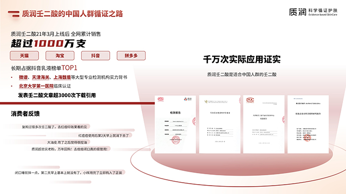 質(zhì)潤壬二酸產(chǎn)品自2021年3月上線以來,全網(wǎng)累計銷售已超過1000萬支,長期占據(jù)抖音乳液榜單TOP1,其市場表現(xiàn)強(qiáng)勁。這一成績不僅證明了質(zhì)潤產(chǎn)品的市場競爭力,更反映了消費者對科學(xué)護(hù)膚理念的認(rèn)同。