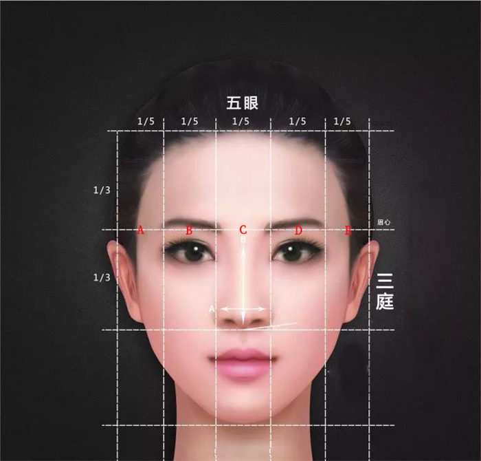 一側(cè)眼睛內(nèi)外眼角之間的距離乘以5,再除以五個(gè)數(shù)據(jù)之和,就得出了五眼比值。