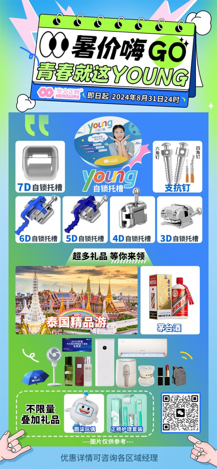 為了讓口腔醫(yī)療機(jī)構(gòu)囤定正畸耗材,滿足暑假超大量需求,華文正畸開展了滿額贈禮、增量送禮等優(yōu)惠活動。即日起至8月31日,下單華文正畸產(chǎn)品,即可享受大禮,活動覆蓋7D、6D、5D、4D、3D自鎖托槽、YOUNG自鎖托槽、支抗釘?shù)榷嗫町a(chǎn)品。