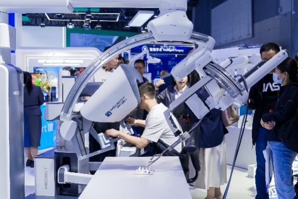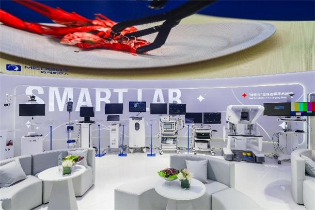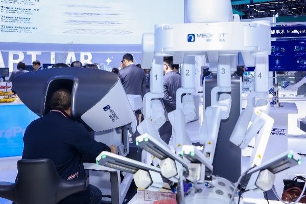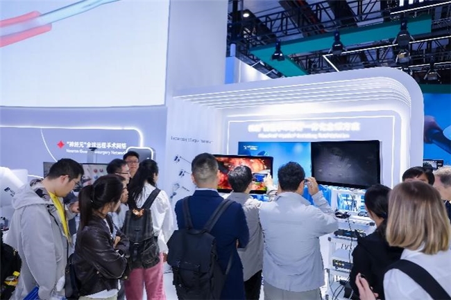 本屆CMEF以“創(chuàng)新科技,智領(lǐng)未來”為主題,AI與醫(yī)療器械的結(jié)合成為會(huì)場(chǎng)矚目的焦點(diǎn)。在微創(chuàng)集團(tuán)展臺(tái),旗下子公司微創(chuàng)機(jī)器人向參展嘉賓展示了“AI+手術(shù)機(jī)器人”的應(yīng)用。微創(chuàng)機(jī)器人帶來了覆蓋腔鏡(圖邁多孔腔鏡手術(shù)機(jī)器人、圖邁單孔腔鏡手術(shù)機(jī)器人、蜻蜓眼3D 4K熒光電子腹腔內(nèi)窺鏡)、骨科(鴻鵠骨科手術(shù)機(jī)器人)、泛血管(R-ONE血管介入手術(shù)機(jī)器人)等多個(gè)領(lǐng)域的全鏈條智能手術(shù)解決方案。公司負(fù)責(zé)人介紹,微創(chuàng)機(jī)器人深耕手術(shù)機(jī)器人與AI技術(shù)的融合研究,早在2021年就已完成全球首例機(jī)器人前列腺自動(dòng)消融手術(shù)。公司通過持續(xù)深度挖掘機(jī)器人全線產(chǎn)品的視覺、影像與臨床數(shù)據(jù),推動(dòng)AI智能水平不斷突破,已在多款產(chǎn)品中實(shí)現(xiàn)AI自動(dòng)手術(shù)規(guī)劃、實(shí)時(shí)影像融合與部分自動(dòng)化手術(shù)操作等功能。