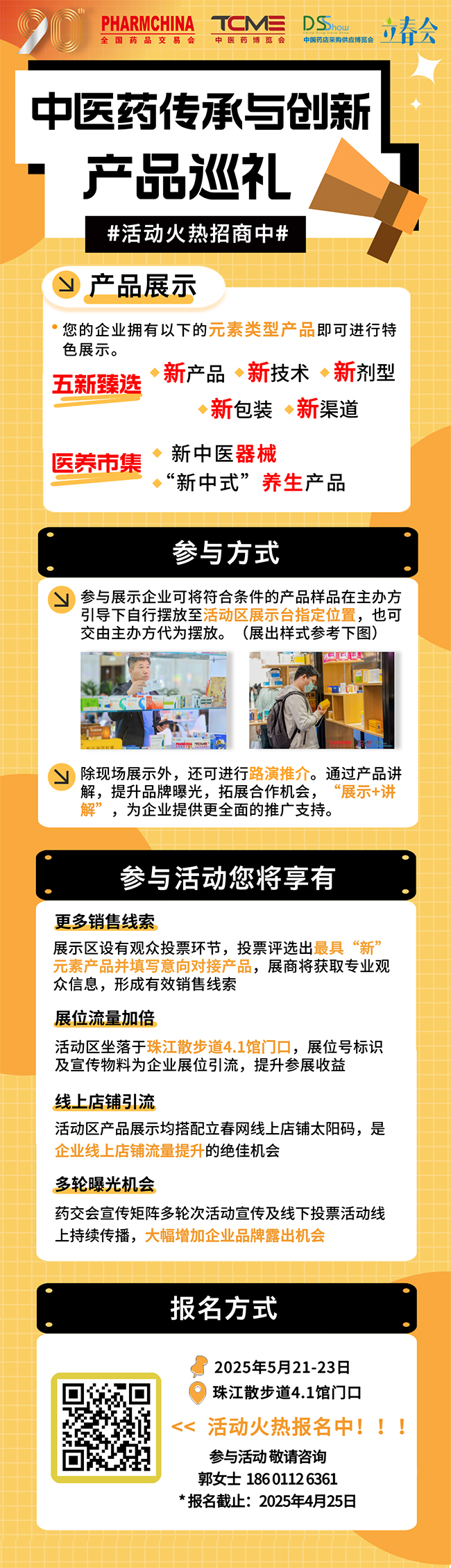2025年5月,第四屆“中醫(yī)藥傳承與創(chuàng)新”產(chǎn)品巡禮活動(dòng)將于第90屆廣州藥交會(huì)同期盛大啟幕!本屆中醫(yī)藥活動(dòng)區(qū)將一如既往地帶來(lái)“新產(chǎn)品、新技術(shù)、新劑型、新包裝、新渠道”優(yōu)質(zhì)產(chǎn)品展示,同時(shí),醫(yī)養(yǎng)療愈市集匯聚新中醫(yī)器械、“新中式” 養(yǎng)生等時(shí)下熱門產(chǎn)品,為行業(yè)提供更多元化的選品選擇!