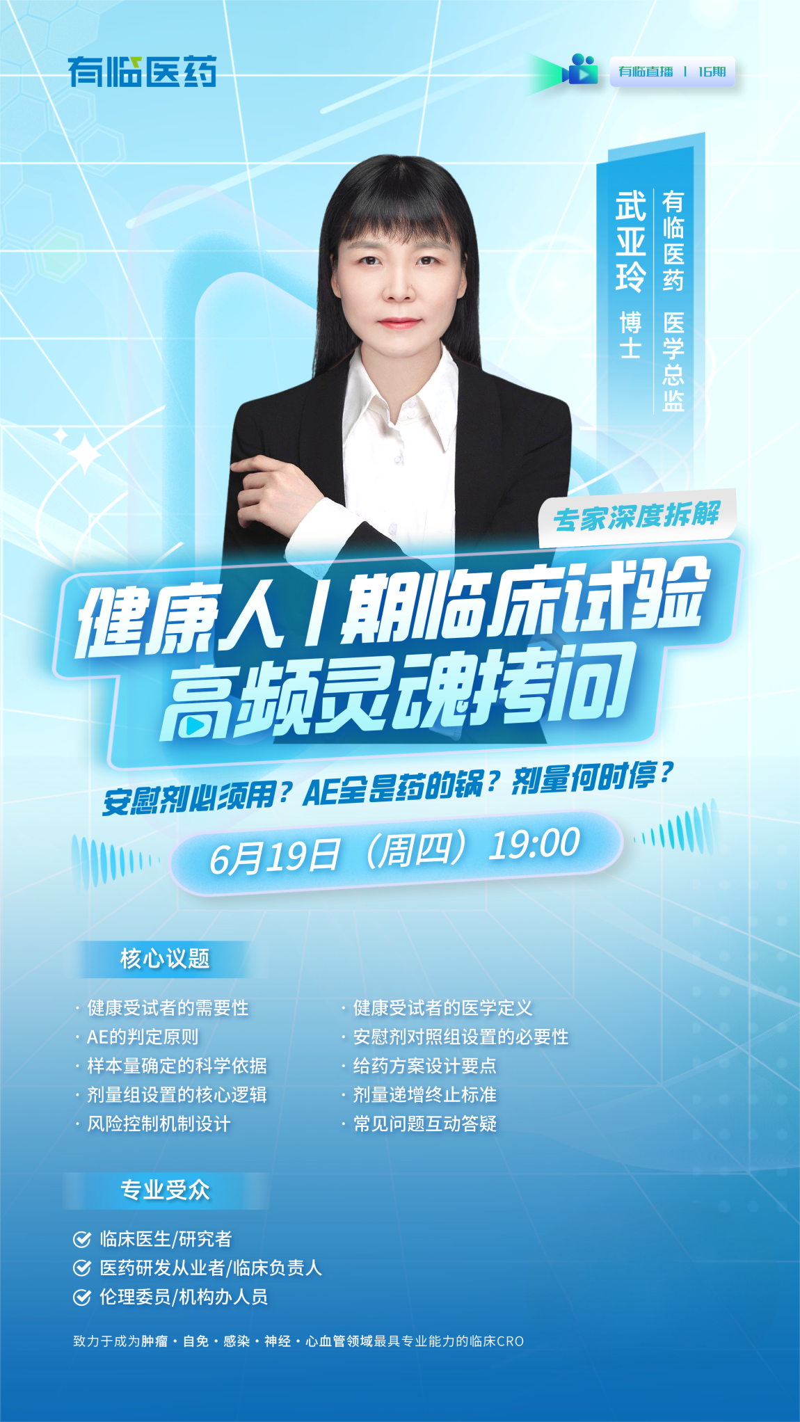 6月19日(周四)晚19:00,有臨醫(yī)學(xué)總監(jiān)武亞玲博士將為您撥開迷霧,直面健康人I期臨床試驗設(shè)計的爭議焦點,帶來一場深度解析與實戰(zhàn)經(jīng)驗并重的專場直播。