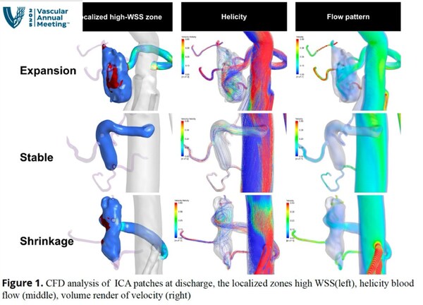 《Intercostal Artery Patch Morphology and Hemodynamics After Thoracoabdominal Aortic Aneurysm Repair: A Long-Term CFD Analysis》,該研究基于上海德達(dá)醫(yī)院 361 例胸腹主動脈替換術(shù)后患者CT影像學(xué)長期隨訪數(shù)據(jù),首次通過計算流體動力學(xué)(CFD)仿真技術(shù),系統(tǒng)分析肋間動脈補片(ICA patch)的形態(tài)學(xué)與血流動力學(xué)動態(tài)變化。通過對ICA補片體積、形態(tài)和分支吻合角度進(jìn)行CFD 量化,為臨床預(yù)測補片擴張/破裂風(fēng)險提供力學(xué)評估模型工具,為優(yōu)化胸腹主替換手術(shù)肋間動脈補片重建提供理論基礎(chǔ)。(詳細(xì)參數(shù)略)