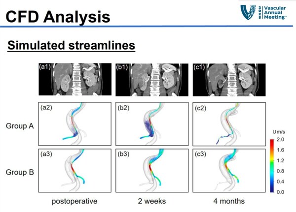 《Role of Computational Fluid Dynamics in Evaluation of Renal Malperfusion after Aortic Dissection Repair》,針對主動脈夾層外科/介入術(shù)后中-遠(yuǎn)期腎臟缺血/萎縮這一臨床難題,團隊創(chuàng)新性地結(jié)合 CFD 與 CT 血管造影(CTA),提出以腎動脈-主動脈壓力比(Renal Artery-Aorta Pressure Ratio, PR)作為評估夾層術(shù)后腎灌注量化指標(biāo),通過CFD動態(tài)監(jiān)測血流數(shù)據(jù)分析,以期在術(shù)后早期預(yù)警高風(fēng)險病變并開發(fā)相應(yīng)預(yù)測工具,為臨床干預(yù)提供關(guān)鍵時間窗口。