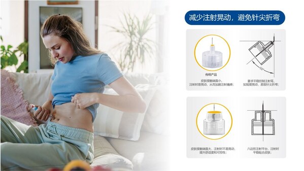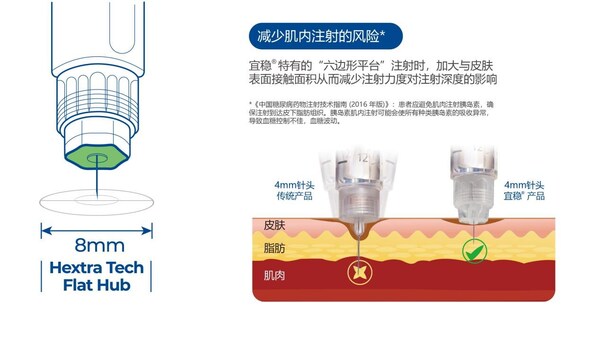 大量研究發(fā)現(xiàn),胰島素肌內(nèi)注射可能導(dǎo)致頻繁的不明原因的低血糖。胰島素肌內(nèi)注射還會(huì)增加發(fā)生出血、淤青及疼痛的風(fēng)險(xiǎn)。除針頭長(zhǎng)度和注射技術(shù)外,針座設(shè)計(jì)是控制注射深度的主要因素,宜穩(wěn)胰島素針頭的大平面設(shè)計(jì)使注射深度受注射施加力的影響有限,更接近4mm針頭長(zhǎng)度。在剛剛發(fā)布的《2025年中國(guó)糖尿病患者注射類降糖藥物使用教育管理規(guī)范》中,對(duì)于胰島素注射筆用針頭明確提出"使用時(shí),為避免注射到肌肉層,建議使用大面積針座(如六棱鼓面針座)"。
