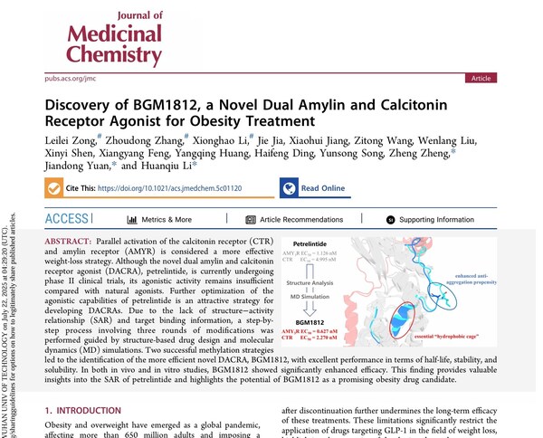 2025年7月,由博瑞醫(yī)藥聯(lián)合AI藥物設計平臺予路乾行共同開發(fā)的候選藥物BGM1812,正式發(fā)表于國際藥物化學權威期刊《JournalofMedicinalChemistry》。作為一款AMY3R與CTR的雙重激動劑,BGM1812在動物模型中不僅展現(xiàn)出顯著的體重控制效果,更在長期給藥下保持了良好的瘦體重指標,體現(xiàn)出"減脂不減肌"的藥效特征。[1]