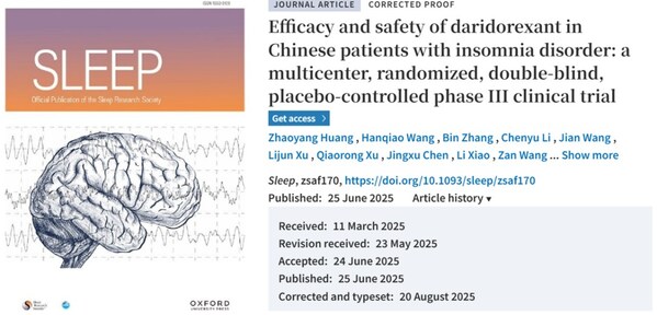 2025年8月20日,新型雙食欲素受體拮抗劑(DORA)類抗失眠達利雷生中國Ⅲ期臨床試驗數(shù)據(jù)在世界睡眠研究協(xié)會官方出版物《睡眠》雜志(SLEEP )正式發(fā)表。結(jié)果顯示:針對中國失眠人群,達利雷生在睡眠維持、加快入睡和延長睡眠時間等指標上均取得陽性結(jié)果,且清晨嗜睡發(fā)生率低。作為首個在中國失眠人群Ⅲ期臨床研究主要及關(guān)鍵次要研究終點均取得陽性結(jié)果,且公開發(fā)表的全新一代DORA類抗失眠藥物,達利雷生為中國數(shù)億失眠人群帶來突破性治療選擇。