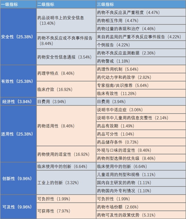 圖1:兒童抗過敏藥物臨床綜合評價系統(tǒng)(指標和權(quán)重)