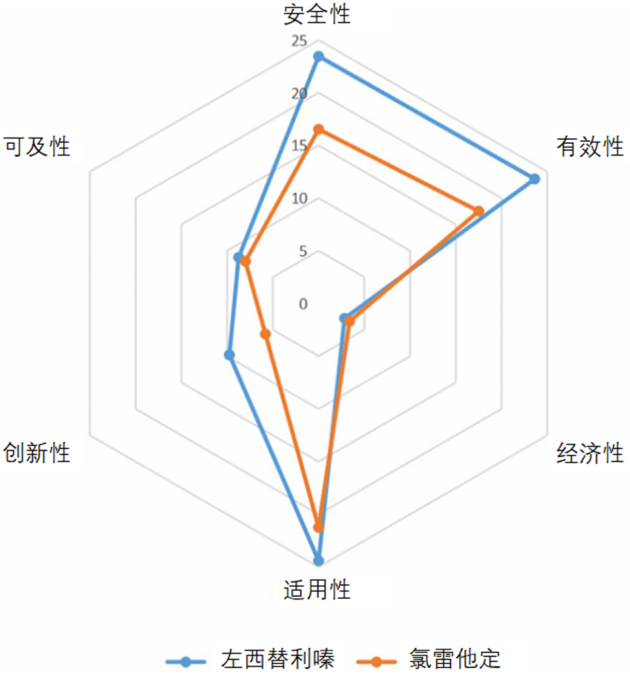 基于上述系統(tǒng),通過文獻梳理和家長問卷調(diào)查收集兩種藥物在實際臨床應(yīng)用中的數(shù)據(jù),結(jié)合藥品說明書、官方監(jiān)測數(shù)據(jù)及診療指南等多來源信息,由專家團隊按統(tǒng)一標準對藥物各項指標進行評分。最后綜合權(quán)重與專家評分,計算總體評價得分,并通過雷達圖直觀呈現(xiàn)兩藥在各維度的表現(xiàn)。