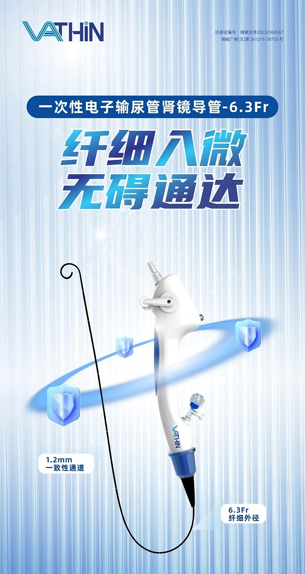 從產(chǎn)品優(yōu)勢(shì)角度出發(fā),以“一次性電子輸尿管腎鏡導(dǎo)管-6.3Fr”為例,基于約2.1mm的超細(xì)鏡體,能夠輕松通過(guò)狹窄輸尿管,進(jìn)而顯著降低輸尿管黏膜損傷風(fēng)險(xiǎn)。此外,通過(guò)搭配9fr的導(dǎo)引鞘,以降低鏡體擺動(dòng)導(dǎo)致的鞘管移位風(fēng)險(xiǎn),穩(wěn)定灌注流量(≥40ml/min),維持清晰術(shù)野。