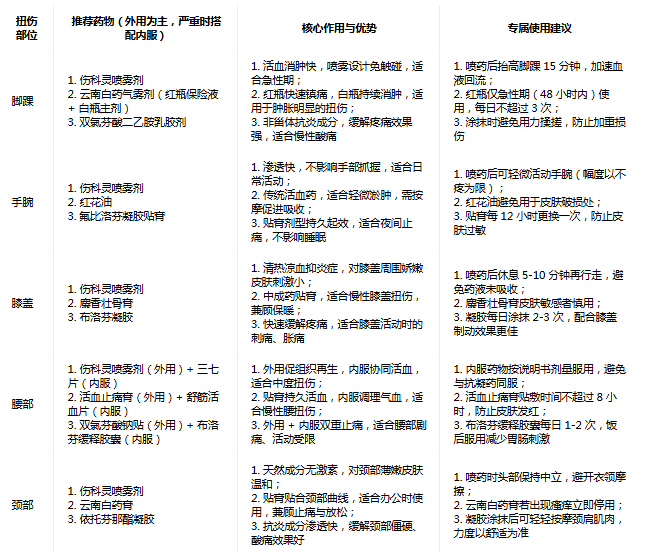 一、按扭傷部位選藥:針對(duì)性匹配,兼顧療效與便捷性
