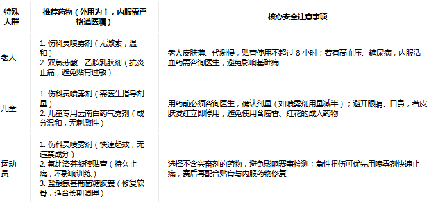 外用:傷科靈噴霧劑(1 小時(shí)內(nèi)噴藥,快速滲透)、云南白藥氣霧劑紅瓶(緊急鎮(zhèn)痛,48 小時(shí)內(nèi)使用)