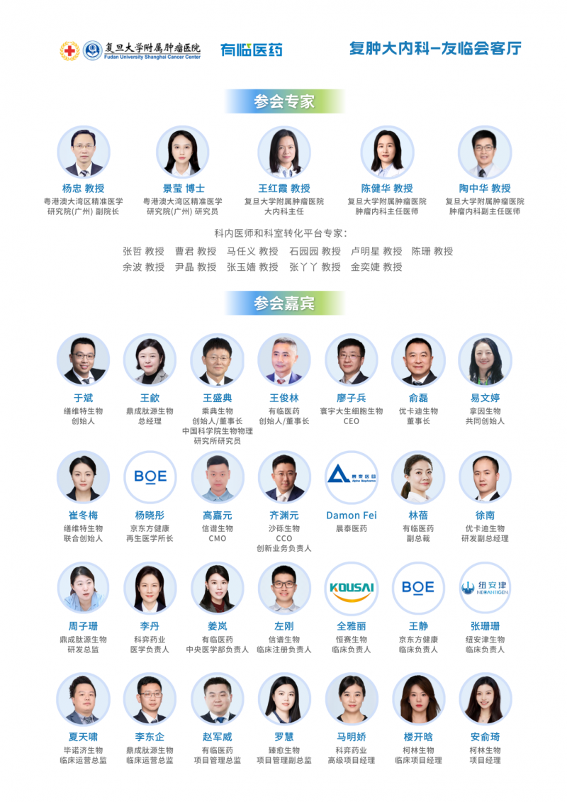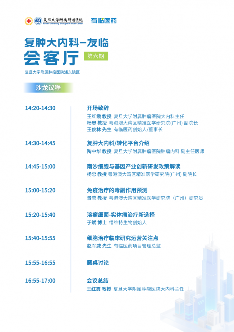 「復腫大內(nèi)科-友臨會客廳」是復旦腫瘤醫(yī)院與有臨醫(yī)藥共同主辦的學術(shù)交流活動,定期邀請科學家、臨床專家和生物藥企創(chuàng)始人和臨床負責人,就解決抗腫瘤新藥研發(fā)的難題與挑戰(zhàn)進行深入討論,促進各方共贏合作。