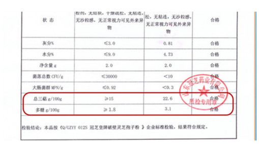 原料好、技術(shù)強(qiáng),最終要靠成分含量說(shuō)話。芝康紀(jì)的實(shí)測(cè)數(shù)據(jù)相當(dāng)亮眼:每100克靈芝粉中,總?cè)坪窟_(dá)22.6克,多糖含量3.1克??赡苣銓?duì)這個(gè)數(shù)字沒(méi)概念,對(duì)比一下就知道了——行業(yè)平均水平中,總?cè)颇艿?2克就不錯(cuò)了,多糖一般在2克左右。也就是說(shuō),芝康紀(jì)的總?cè)坪繋缀跏切袠I(yè)平均的2倍,多糖也高出50%???cè)剖谴x調(diào)節(jié)的小能手,多糖是免疫養(yǎng)護(hù)的好幫手,這么高的含量,再加上99.99%的吸收率,養(yǎng)生效果自然事半功倍。