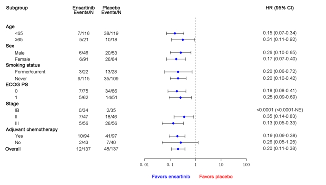 截止到2025年6月26日,在II-IIIB期患者中,兩組中位隨訪(fǎng)時(shí)間均為24.0個(gè)月。DFS HR為0.20(95% CI: 0.11-0.38;p<0.0001);恩沙替尼組2年DFS率為86.4%,安慰劑組為53.5%。在ITT人群中,DFS HR為0.20(95% CI: 0.10-0.37; p<0.0001);恩沙替尼組2年DFS率為87.3%,而安慰劑組為57.2%。各亞組中,傾向于恩沙替尼的DFS獲益一致。在ITT人群中觀察到具有臨床意義的CNS-DFS益處(HR 0.22;95% CI: 0.08-0.60)。OS不成熟(1%成熟度)。安全性與恩沙替尼的已知安全性一致。