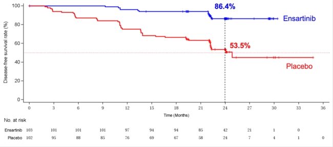 受試者按1:1隨機(jī)接受恩沙替尼(225 mg QD)或安慰劑治療2年或2年內(nèi)疾病復(fù)發(fā)或達(dá)到其他終止治療的標(biāo)準(zhǔn),隨機(jī)分組根據(jù)術(shù)后腫瘤分期(IB期 vs II期 vs III期)和是否接受輔助化療(是 vs 否)為分層因素。