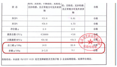 品高品牌的靈芝來自湖北神農(nóng)架地區(qū),采用氣流冷破工藝與二次精濾技術(shù)相結(jié)合。檢測數(shù)據(jù)顯示其三萜約15.9克,多糖2.0克。