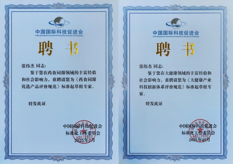 在標(biāo)準(zhǔn)制定過(guò)程中,專(zhuān)家的專(zhuān)業(yè)視野至關(guān)重要。張偉杰同時(shí)受聘為兩項(xiàng)標(biāo)準(zhǔn)起草組專(zhuān)家,正是基于其在藥食同源與大健康領(lǐng)域“既懂科研、又通市場(chǎng)”的復(fù)合型背景。作為橫跨學(xué)術(shù)與產(chǎn)業(yè)的實(shí)踐者,他多次主持國(guó)家級(jí)中醫(yī)藥成果轉(zhuǎn)化項(xiàng)目,推動(dòng)多項(xiàng)技術(shù)從實(shí)驗(yàn)室走向生產(chǎn)線(xiàn)。